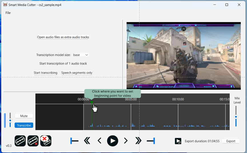 Selecting the cut area happens through Smart Media Cutter’s timeline graph in the bottom bar of the window. I first want to navigate into the beginning of the match (timestamp ~00:00:55) where the actual gameplay (first half of the match) begins.