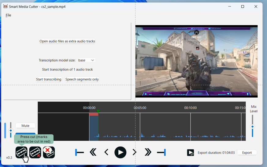 Download, install, and open Smart Media Cutter software on your computer. You can next open a file for editing such as my 1h 4min long CS GO stream that I’d like to cut into two separate CS GO clips (~30min each).