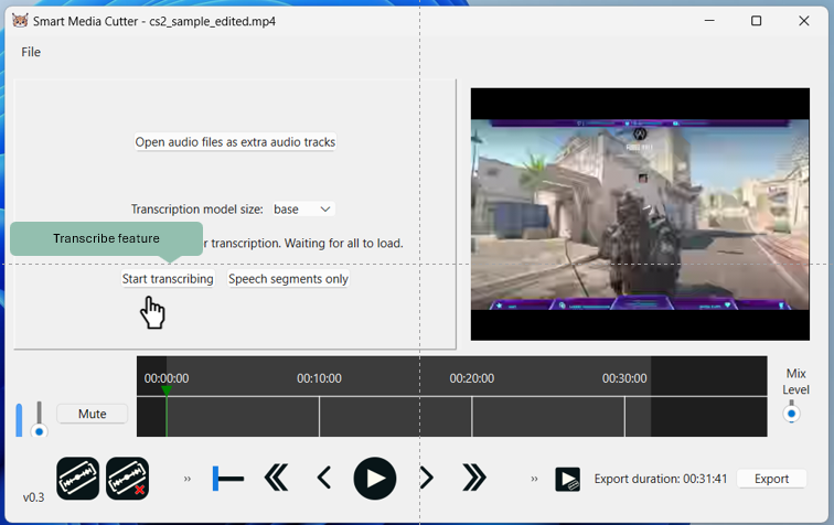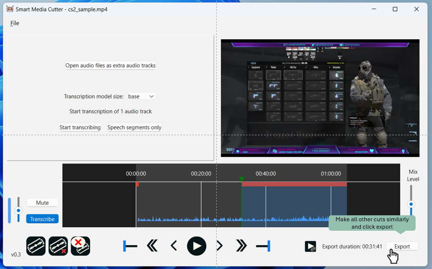 Later I can come back back to my edited CS GO video and use e.g., Smart Media Cutter’s transcribe feature, which let’s me easily to graps the most engaging content of the video, which can be used to drive even more traction e.g., through YouTube shorts.