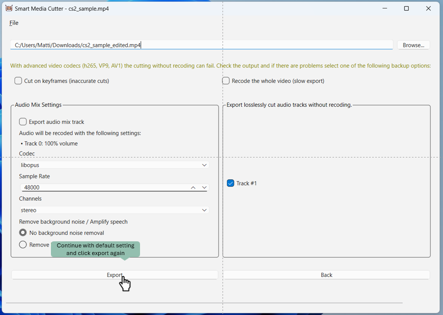 After selecting all the areas to be cut, I can export the edited video with default export settings.
