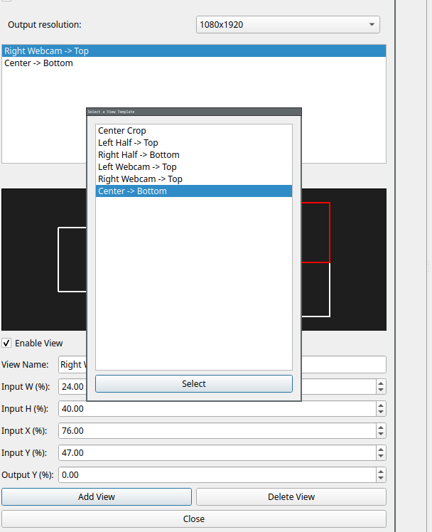 Here you see the new vertical video transform dialog, used for editing the where the relevant content is located in the input stream and where it should be placed in the output. Some sort of editor like this is necessary since every stream or other input video has their own setup.
