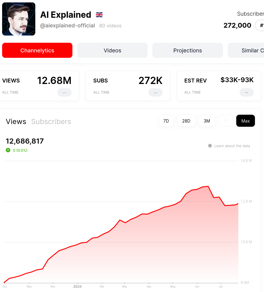 AI Explained is one of more successful new AI edutainment channels. Started in Jan 2023 (after ChatGPT), it has seen very good growth over the last year and half.