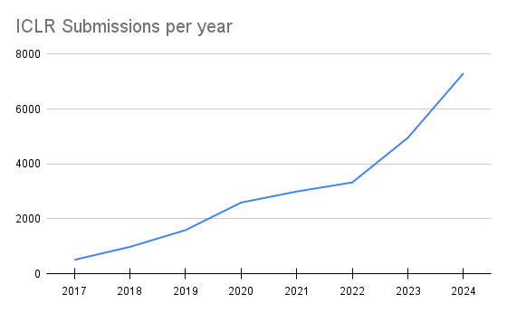 Number of papers submitted to ICLR, one of the top machine learning conferences, has more than doubled since 2022. Other big conferences are not quite as bad, but they still growing rapidly each year.